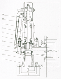A47H/W帶扳手彈簧微啟式安全閥 適用于工作溫度≤350℃的蒸汽、空氣等介質的設備或管路上。作為超壓保護裝置。連接法蘭標準按JB/T-94的系列1。